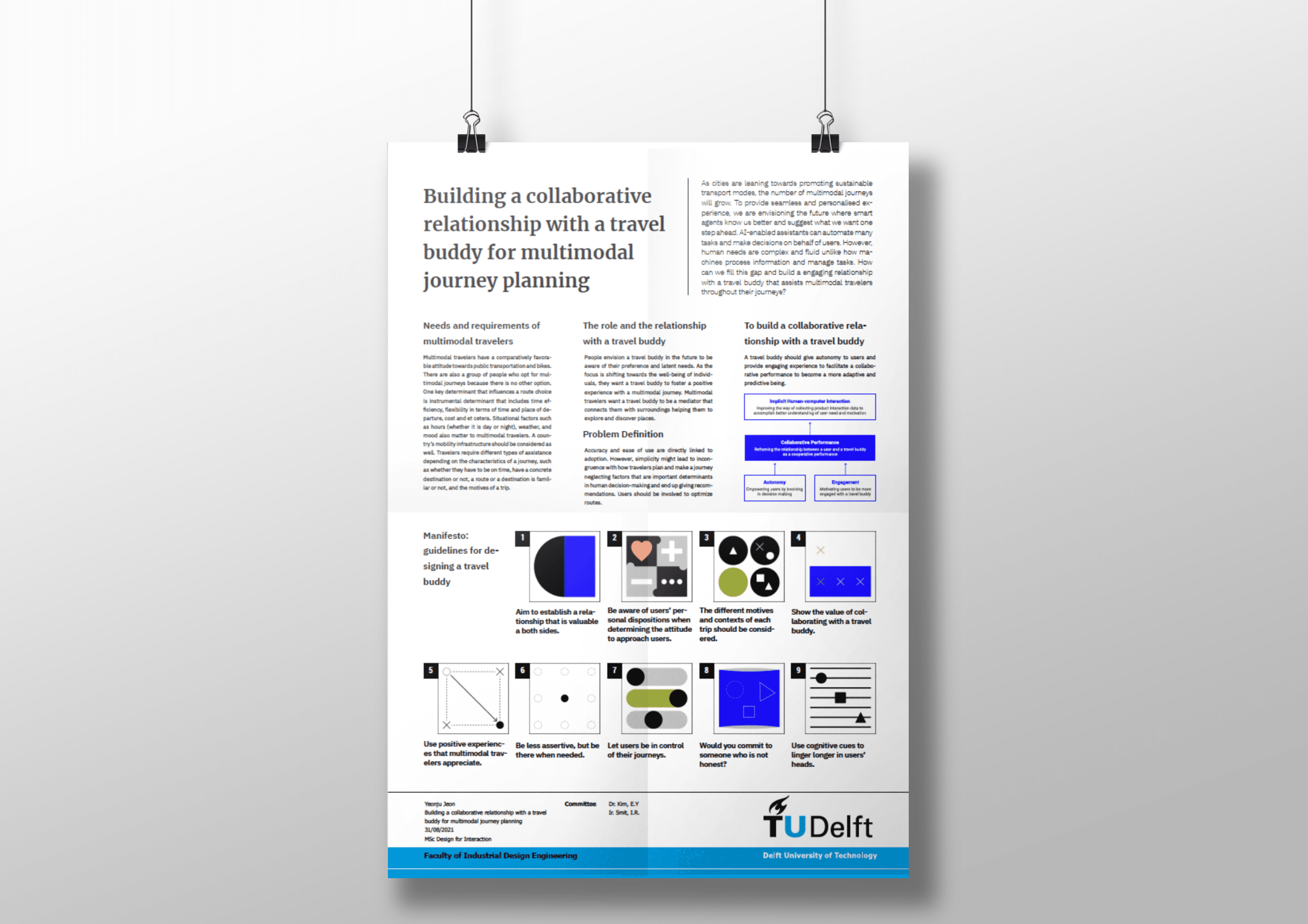 This Master’s thesis explores how travelers plan and navigate multimodal trips and introduces Travel Buddy, a conceptual AI-powered travel assistant designed to provide adaptive, user-driven route planning. Unlike current systems that passively deliver route recommendations, Travel Buddy actively learns from user behavior, integrates personal data, and allows for customizable trip preferences.