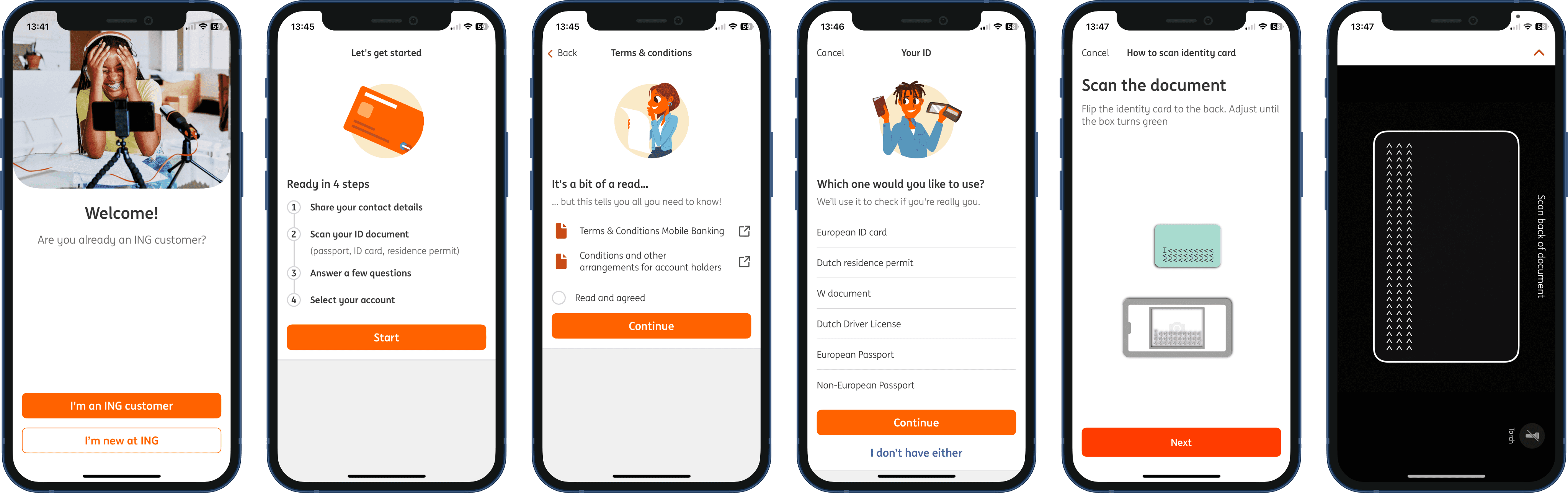Using ING’s design system, I developed a flexible and scalable modular system that integrates three core features: document capture, NFC scanning, and facial verification. These modules were designed for seamless integration, allowing diverse consumers to customize and embed them into any journey requiring verification, from opening an account to setting up the app on a new device and beyond. The verification process operates consistently across web, iOS, and Android platforms, ensuring accessibility on desktops, smartphones, tablets, and other devices. Emphasis was placed on clear instructions and frictionless navigation to boost completion rates and reduce drop-offs.